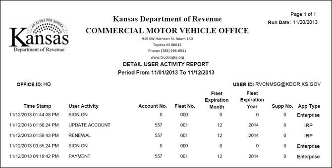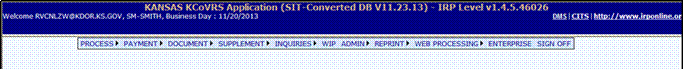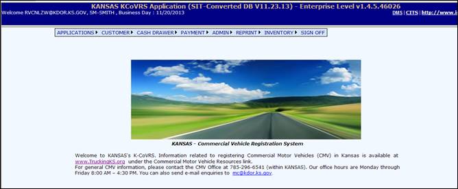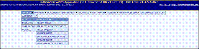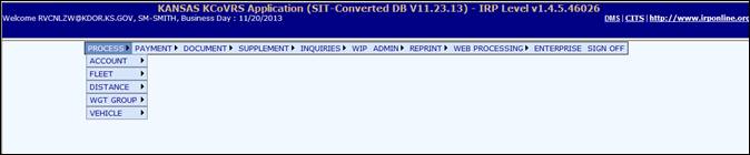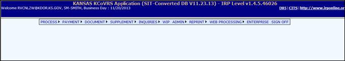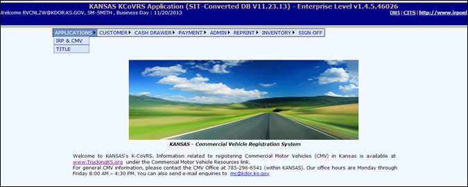 For example, selecting IRP & CMV from the Applications submenu will display the IRP & CMV level screen and menu. The menu items displayed depend on the user role in KCoVERS.