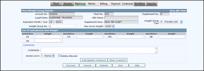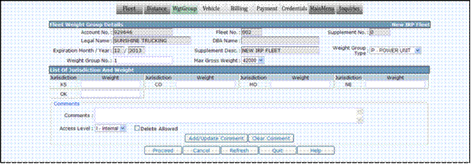 The Tab color indicator schema is as follows: Tab items in grey (Fleet and Distance) indicate screens the user has navigated through. The highlighted tab (Weight) indicates the tab currently being processed. The remaining tabs (i.e. Vehicle, Billing, Payment, etc.) indicate processing yet to happen. The user may navigate back to a previous tab by selecting the desired tab. The MAIN MENU and INQUIRIES tab are there for all transactions.