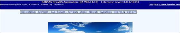 Each KCoVERS application will have its own menu bar which is specific to the application functionality. After the application is selected, the main menu bar will display. The menu options displayed are dependent on the user’s role in KCoVERS.