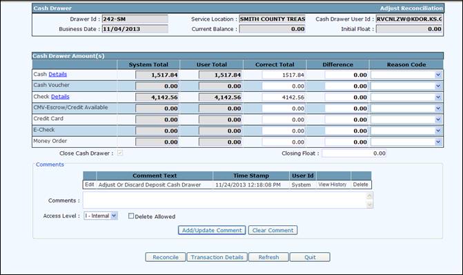 · Reconcile Cash Drawer – reconcile the cash drawer for the Business Day