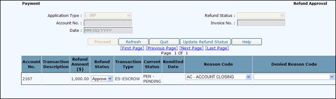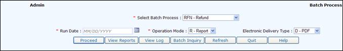 The refund batch process creates the refund notice for all approved refunds. This process can be executed in either a report mode (no update) or update mode. Report mode creates a report of all refunds scheduled to have the refund notice created and does not create the refund notice. Update mode creates the report and the refund notice. The process will be scheduled in the update mode.