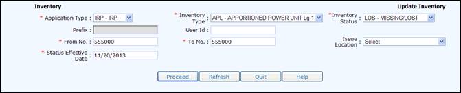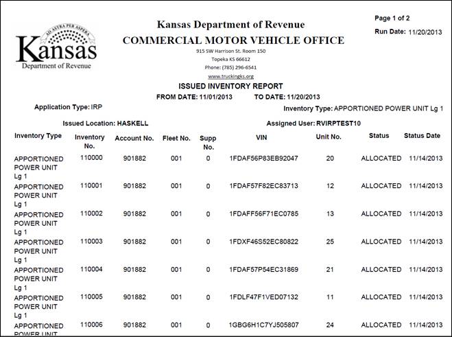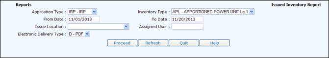 The Issued Inventory report gives information on issued/allocated inventory as well as other status including Damaged, Missing etc. The authorized user can provide the following search parameters for the report. At a minimum either an INVENTORY TYPE or a date range is required.