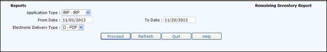 The Remaining Inventory report gives information remaining inventor. The authorized user can provide the following search parameters for the report. At a minimum either an INVENTORY TYPE or a date range is required.